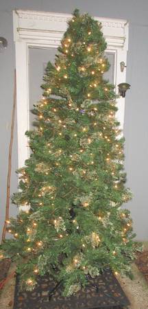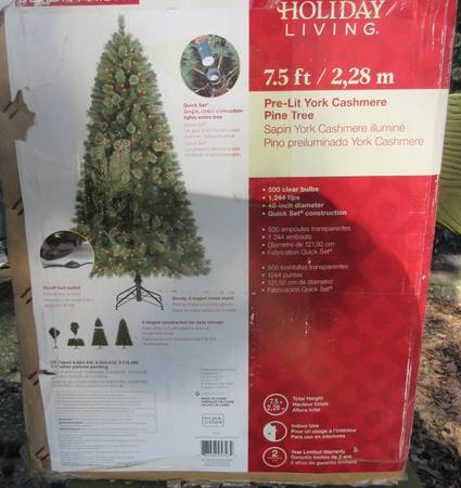 BEAUTIFUL PRE-LIT YORK CASHMERE PINE CHRISTMAS TREE. PICS ARE TAKEN OUTSIDE BECAUSE I DIDN'T HAVE A LARGE ENOUGH SPACE INSIDE TO PICTURE IT. IT IS STORED INSIDE. TREE IS 7.5 FEET TALL, HAS 500 CLEAR LIGHTS,1,244-TIPS, AND IS 4-FEET WIDE AT BOTTOM. IT HAS AN ON/OFF FOOT SWITCH. TREE WAS USED ONLY ONCE AND IS IN LIKE NEW CONDITION. FROM A SMOKE FREE HOME. IT IS EASY SET CONSTRUCTION. IT IS IN ORIGINAL BOX FOR EASY STORAGE. IT COST A LOT WHEN NEW. PRICE IS $125.00.
