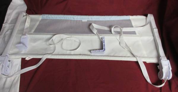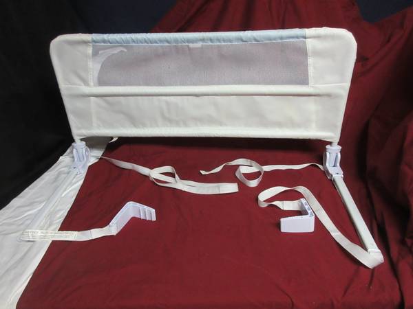 The lightweight extendable metal frame, measuring 18" inches tall and extending 36" inches wide, is padded, covered with fabric, and fits mattress sizes twin to queen. The secure locking mechanism and convenient hinged folding design makes lifting your child and changing their bedding easy. No assembly required.