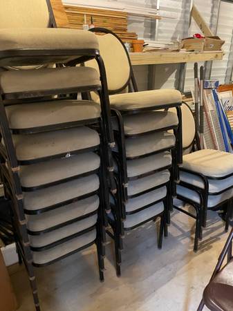 19 Cushion Stackable Chairs fair condition and comfortable. Take all 20 for 95.00 Or 10 fir 50.00 ———— ALSO ——- About 11 dark brown steel chairs for 4.00 each or 3.00 ea if you buy all 11 TEXT ME TO...