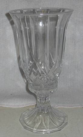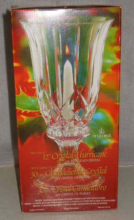 NEW! 24% Fine Lead Crystal Hurricane Candle Holder 2 pieces, Globe piece sits on it's base stand and measures 12" tall Made by St. George in the USA $20.00 Brand new in box