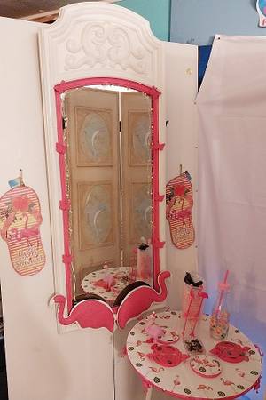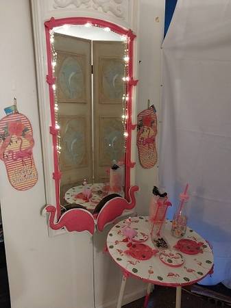 HI everyone,,,I designed this mirror and table...I made the flamingos myself to go on mirror..Everything is included except the door it is on...